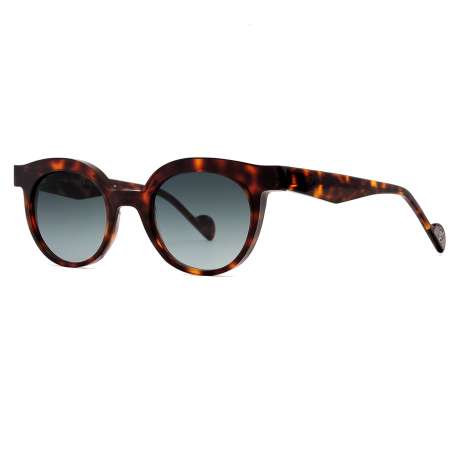 Ces lunettes de soleil Sacha de la collection Anne et Valentin sont fabriquées dans une plaque d'acétate de cellulose couleur écaille foncée, et sont équipées de verres organiques dégradé Gris
